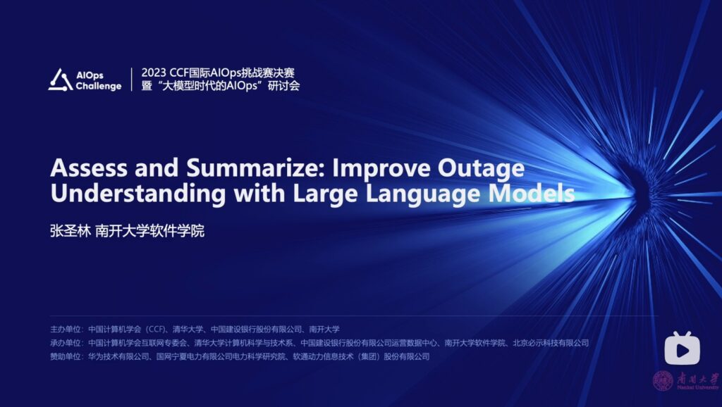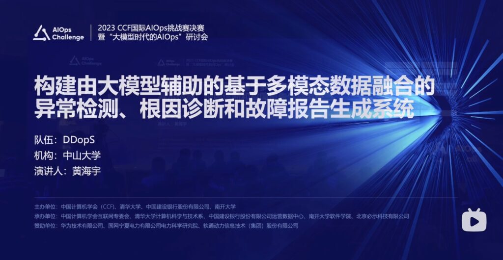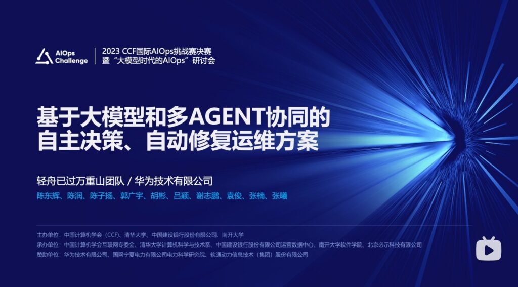视频 ➔ OpenAIOps社区视频 欢迎您提交资源 2024 标题:AIOps在线评测基准首阶段建设完成,发布真实数据 讲者:聂晓辉 单位:必示科技 时间:2024.05 地点:线下 标题:2024 CCF国际AIOps挑战赛·赛题与赛制解读 讲者:裴昶华 单位:中国科学院计算机网络信息中心 时间:2024.05 地点:线下 标题:大语言模型及提示工程在日志分析任务中的应用 讲者:陶仕敏 单位:华为 时间:2024.03 地点:线下 标题:网易游戏智能运维AIOps落地实践用 讲者:宾哲 单位:网易游戏数据与平台服务部 时间:2024.02 地点:线上 2023 标题:基于上下文学习的自动化日志语句生成研究 讲者:贺品嘉 单位:香港中文大学 时间:2023.12 地点:2023 CCF国际AIOps挑战赛决赛暨“大模型时代的AIOps”研讨会 标题:基于知识增强的日志预训练语言模型 讲者:徐波 单位:东华大学 时间:2023.12 地点:2023 CCF国际AIOps挑战赛决赛暨“大模型时代的AIOps”研讨会 标题:基于大语言模型的数据库异常诊断系统 讲者:周煊赫 单位:清华大学 时间:2023.12 地点:2023 CCF国际AIOps挑战赛决赛暨“大模型时代的AIOps”研讨会 标题:大语言模型及提示工程在日志分析任务中的应用 讲者:陶仕敏 单位:华为 时间:2023.12 地点:2023 CCF国际AIOps挑战赛决赛暨“大模型时代的AIOps”研讨会 标题:基于LLM的多场景智能运维 讲者:王宁 单位:字节跳动 时间:2023.12 地点:2023 CCF国际AIOps挑战赛决赛暨“大模型时代的AIOps”研讨会 标题:基于大模型和多AGENT协同的运维 讲者:轻舟已过万重山团队 单位:华为 时间:2023.12 地点:2023 CCF国际AIOps挑战赛决赛暨“大模型时代的AIOps”研讨会 标题:顶会ICLR2024论文Time-LLM分享:通过重编程大型语言模型进行时间序列预测 讲者:Qingsong Wen 单位:松鼠AI 时间:2023.12 地点:2023 CCF国际AIOps挑战赛决赛暨“大模型时代的AIOps”研讨会 标题:面向服务架构下无故障标注的节点故障识别与分类 讲者:赵建波 单位:华为 时间:2023.12 地点:2023 CCF国际AIOps挑战赛决赛暨“大模型时代的AIOps”研讨会 标题:服务器集群异常检测及根因分析 讲者:张云飞 单位:北京城建智控科技股份有限公司 时间:2023.12 地点:2023 CCF国际AIOps挑战赛决赛暨“大模型时代的AIOps”研讨会 标题:LLM和Agent技术在AIOps领域的应用探索 讲者:胡牛犇 单位:中原银行 时间:2023.12 地点:2023 CCF国际AIOps挑战赛决赛暨“大模型时代的AIOps”研讨会 标题:基于建行云龙舟运维平台的稳定性工具和多维监控系统故障识别和故障分类 讲者:王潇霏 单位:南开大学 时间:2023.12 地点:2023 CCF国际AIOps挑战赛决赛暨“大模型时代的AIOps”研讨会 标题:ICLRNeurIPS论文分享:任务通用的时序基础模型 讲者:Haixu Wu 单位:清华大学 时间:2023.12 地点:2023 CCF国际AIOps挑战赛决赛暨“大模型时代的AIOps”研讨会 标题:通过大语言模型理解运维故障:评估和总结 讲者:张圣林 单位:南开大学 时间:2023.12 地点:2023 CCF国际AIOps挑战赛决赛暨“大模型时代的AIOps”研讨会 标题:面向微服务架构系统中无标注、多模态运维数据的异常检测、根因定位与可解释性分析 讲者:彭程 单位:国电南瑞科技股份有限公司 时间:2023.12 地点:2023 CCF国际AIOps挑战赛决赛暨“大模型时代的AIOps”研讨会 标题:构建由大模型辅助的基于多模态数据融合的异常检测、根因诊断和故障报告生成系统 讲者:黄海宇 单位:中山大学 时间:2023.12 地点:2023 CCF国际AIOps挑战赛决赛暨“大模型时代的AIOps”研讨会 标题:基于图网络及LLM AGENT的微服务系统异常检测和根因定位方法 讲者:崔世彬 单位:亿阳信通股份有限公司 时间:2023.12 地点:2023 CCF国际AIOps挑战赛决赛暨“大模型时代的AIOps”研讨会 标题:运维大语言模型评测基准OpsEval解读 讲者:裴昶华 单位:中国科学院计算机网络信息中心 时间:2023.12 地点:2023 CCF国际AIOps挑战赛决赛暨“大模型时代的AIOps”研讨会 标题:大模型时代的AIOps 讲者:裴丹 单位:清华大学 时间:2023.12 地点:2023 CCF国际AIOps挑战赛决赛暨“大模型时代的AIOps”研讨会 标题:运维数字化转型:生态运营和场景开发的底座构建 讲者:朱凤涛 单位:广通优云 时间:2023.12 地点:2023 CCF国际AIOps挑战赛决赛暨“大模型时代的AIOps”研讨会 标题:在确定性和不确定性中探索AIOps的适用性 讲者:徐新龙 单位:蚂蚁集团 时间:2023.12 地点:线上 标题:虎牙直播AIOps探索与实践 讲者:郑健彦 单位:虎牙直播 时间:2023.12 地点:线上 标题:AIOps智能运维新态势-AlOps引领未来IT运维的智能革命圆桌论坛 讲者:无 单位:无 时间:2023.10 地点:线上 标题:AIOPS — 日志的分析与挖掘的研究现状 讲者:李锦路/李昱鑫 单位:华东师范大学 时间:2023.08 地点:AI + Serverless Meetup 上海站 标题:民生银行的应用运维AIOps实战 讲者:张舒伟 单位:民生银行 时间:2023.08 地点:线上 2022 标题:2022 AIOps 答辩 讲者:/ 单位:/ 时间:2022.12 地点:CCF国际AIOps挑战赛决赛暨AIOps研讨会 标题:无监督的微服务异常根因定位系统 讲者:甘雨 单位:阿里云 时间:2022.12 地点:CCF国际AIOps挑战赛决赛暨AIOps研讨会 标题:SPINE:反馈支持的高扩展日志解析器 讲者:何世林 单位:微软亚洲研究院 时间:2022.12 地点:CCF国际AIOps挑战赛决赛暨AIOps研讨会 标题:云原生可观测技术探讨 讲者:张城 单位:阿里云可观测平台 时间:2022.12 地点:CCF国际AIOps挑战赛决赛暨AIOps研讨会 标题:面向大规模Web服务的多指标实例聚类 讲者:孙永谦 单位:南开大学 时间:2022.12 地点:CCF国际AIOps挑战